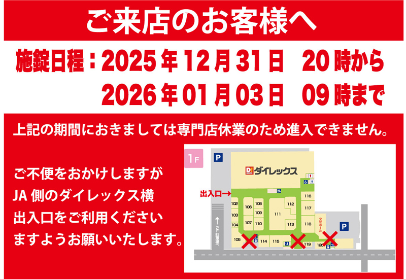 ※専門店側は元旦~2日まで封鎖のため出入口はJA側のみとなります